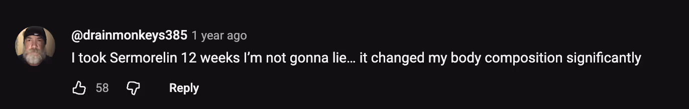 “I took Sermorelin for 12 weeks. I'm not gonna lie… it changed my body composition significantly.” – Drainmonkeys385, YouTube User.
