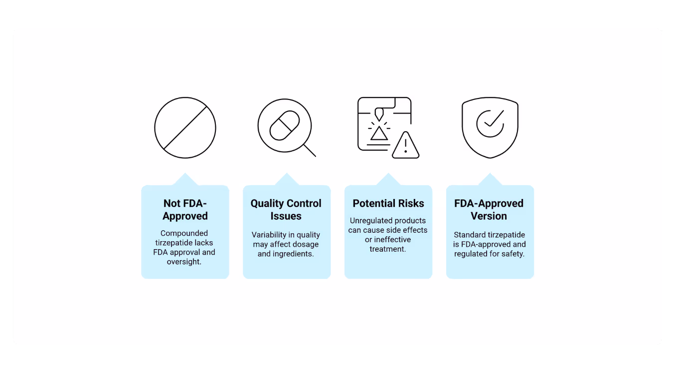 Compounded tirzepatide isn’t FDA-approved like Mounjaro or Zepbound. It skips formal testing for safety, effectiveness, and quality, leaving you dependent on the standards of the pharmacy making it.