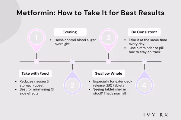 Take metformin at the same time each day to maintain steady blood levels. Set reminders on your phone or use a pill organizer to help establish this routine.