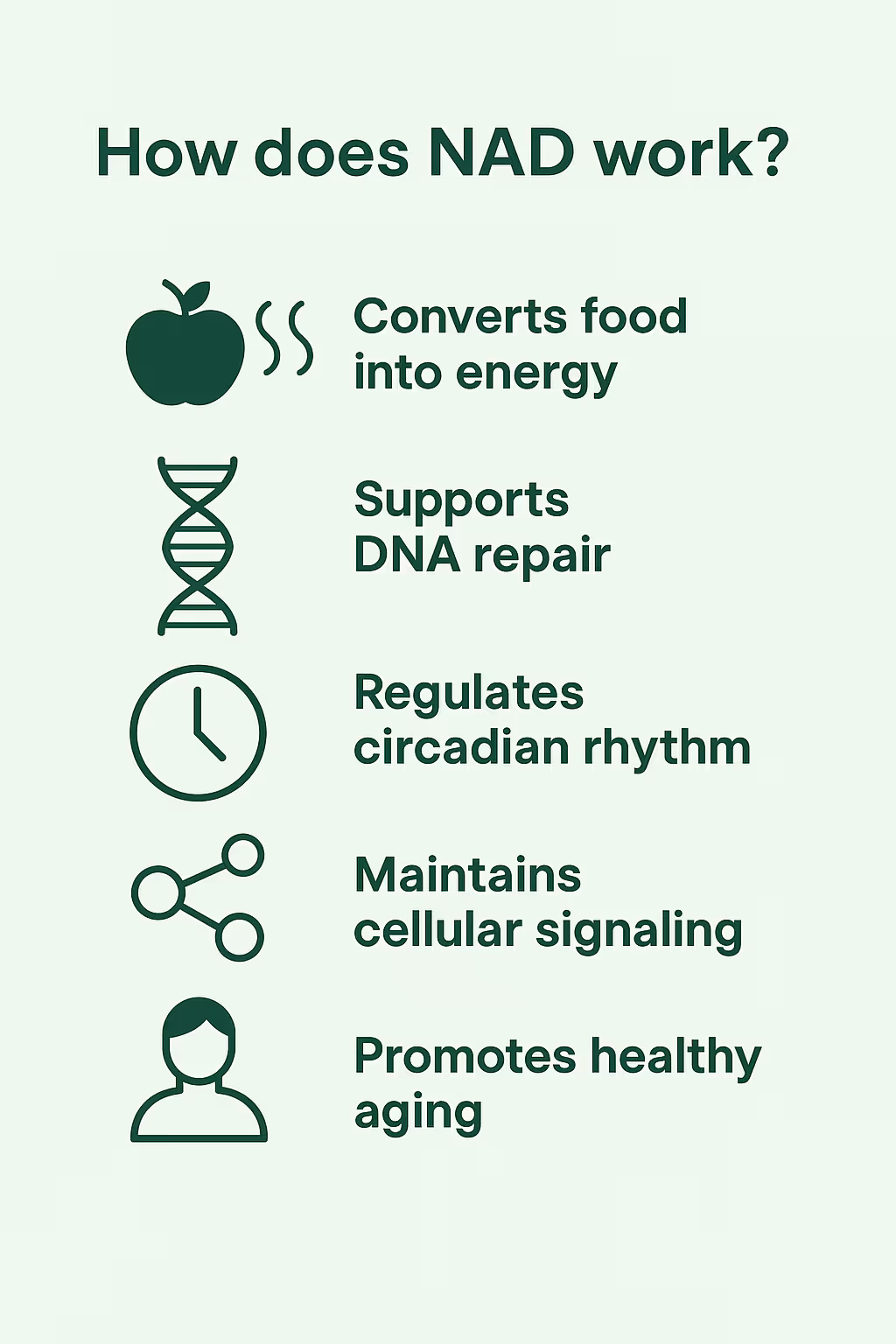 When your cells lack sufficient NAD+, they struggle to function properly. This can manifest as fatigue, mental fogginess, slower recovery from exercise, and even accelerated aging signs like wrinkles and decreased muscle tone.
