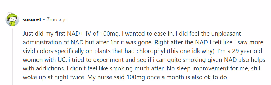 Reddit users share compelling experiences with NAD+ IV treatments. One person noted, seeing “more vivid colors… and because of that, I feel happier ☺️ it's my first time today. I was able to do more, as I have more energy."
