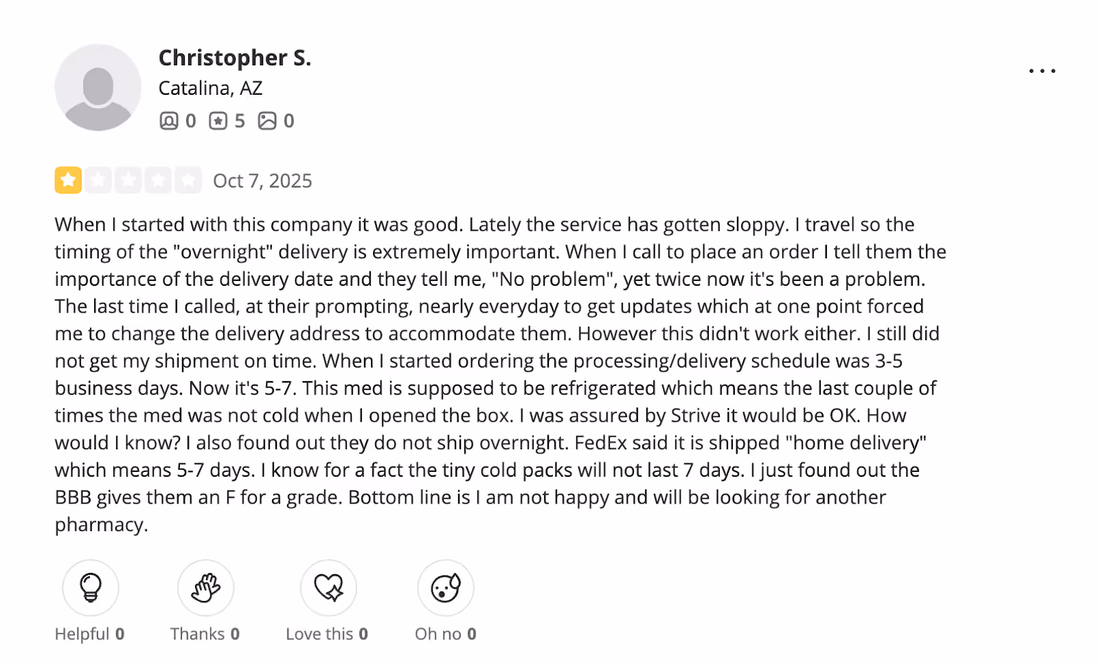 Another user cites a negative for product availability. One long-time Strive Pharmacy customer reported growing frustration with delivery delays and medication handling. They explained that shipping times increased from 3–5 days to 5–7 days, causing their refrigerated medication to arrive warm.
