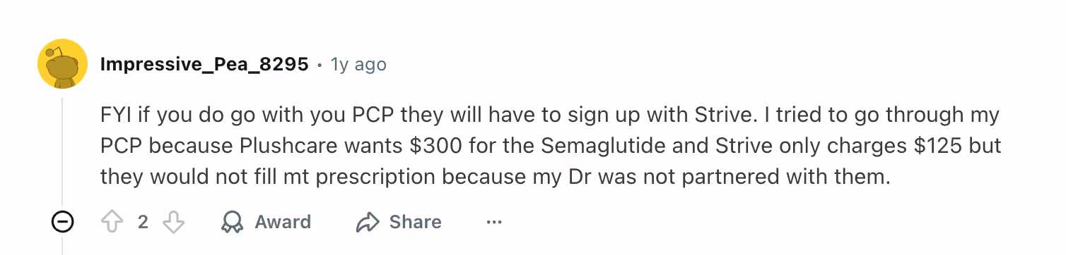 Another Reddit user explained that they received Strive Pharmacy’s semaglutide by asking their primary care provider for a prescription. At the time of the review, the medication cost $125 directly from Strive.