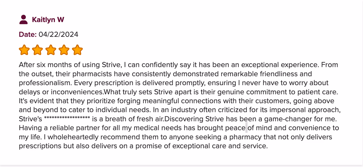 A long-term Strive Pharmacy user praised the pharmacy’s customer service and reliability after six months of consistent use on BBB. The reviewer highlighted that “What truly sets Strive apart is their genuine commitment to patient care... they go above and beyond to cater to individual needs.” Kaitlyn W.