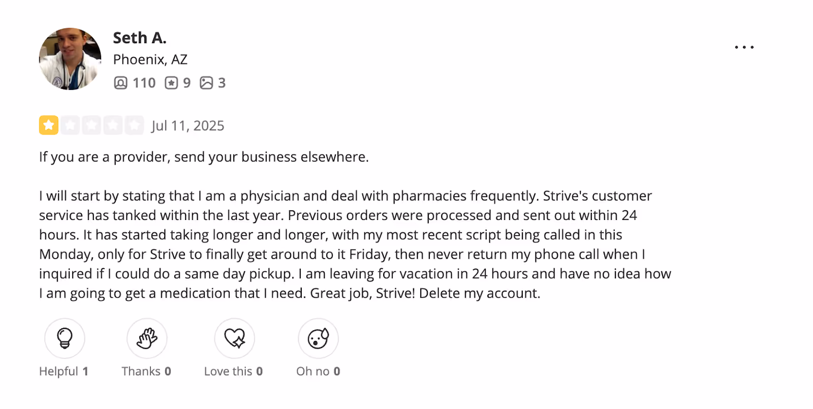 A physician who frequently works with pharmacies shared frustration over Strive’s declining service quality on Yelp, citing slower processing times and poor communication. The reviewer noted tha “Strive's customer service has tanked within the last year... my most recent script was called in Monday, and they didn’t get to it until Friday, then never returned my call.” — Seth A.